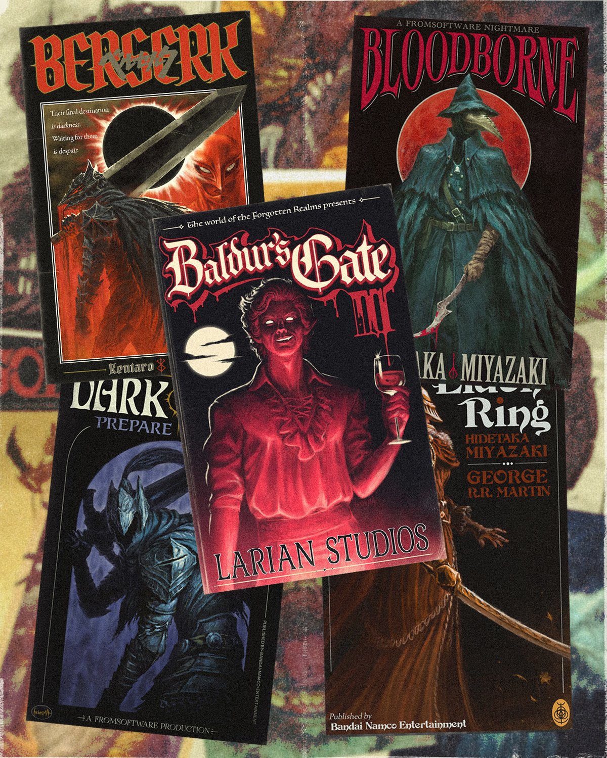 Among these prints will be one of my faux retro poster print designs (Baldur's Gate, Elden Ring, Bloodborne, Dark Souls, and Berserk). If you’d prefer one in particular with your order, feel free to leave me a note with details on your order when you checkout.